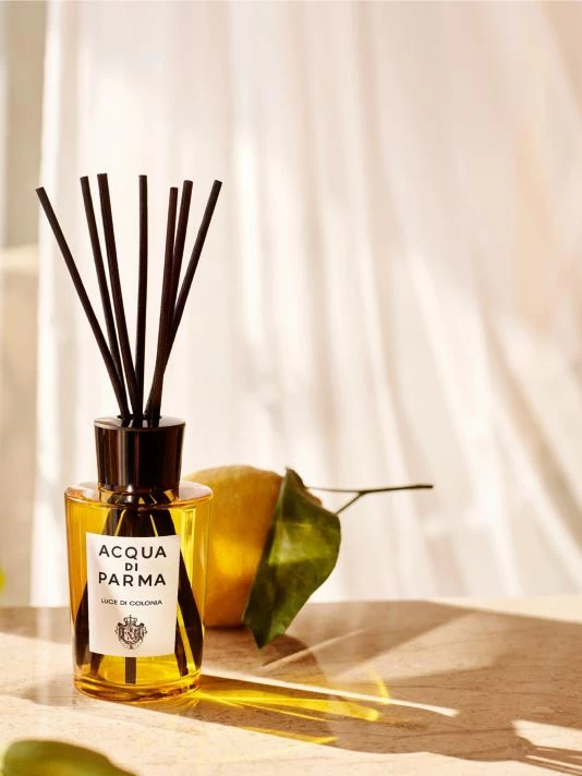 From the Home Collection. Elegantly timeless, Luce di Colonia embodies the quintessential essence of the scent universe. The diffuser, inspired by the signature Colonia, radiates brightness and lightness through your home with its harmonious blend of citrus essences. Scents include are orange, lemon, petitgrain, neroli, patchouli and vetiver. It opens with the sparkling freshness of citrus notes and continues with aromatic heart notes, both floral and elegant. The scent comes together with woody base notes.