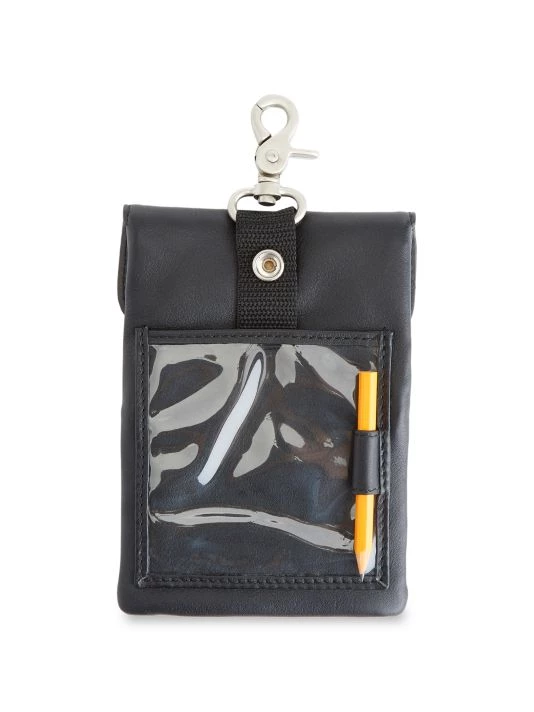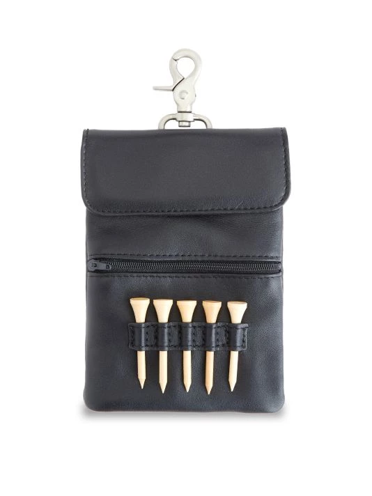 This leather golf accessory bag features five slots for tees, a zipper pocket for the divot tool and ball markers while the back has a framed pocket for a score card and pen loop.