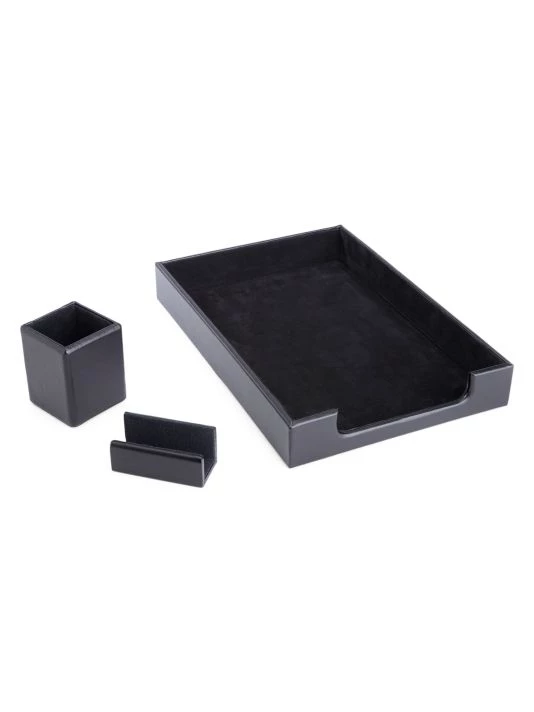 Boardroom ready. Designed for the contemporary executive, this ROYCE office collection features handmade genuine leather desk pencil cup organizer, genuine leather desk letter tray and genuine leather business card display holder. All three accessories are lined with luxurious grey suede.