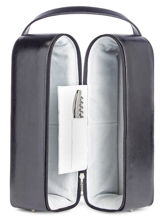 This elegant wine carrying case fits a standard sized wine bottle and includes a stainless steel corkscrew and bottle opener. The full grain American leather case is carefully padded with rich suede to ensure safe carrying.